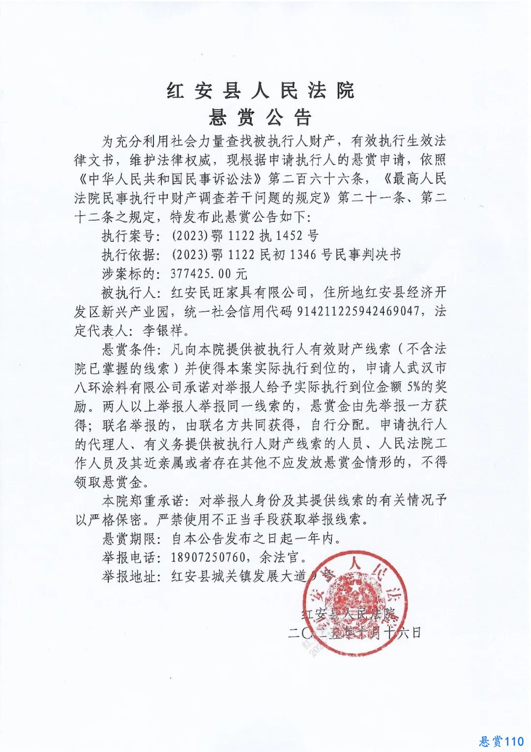 悬赏条件:凡向本院提供被执行人有效财产线索(不含法院已掌握的线索)并使得本案实际执行到位的,申请人武汉市八环涂料有限公司承诺对举报人给予实际执行到位金额5%的奖励。两人以上举报人举报同一线索的,悬赏金由先举报一方获得;联名举报的,由联名方共同获得,自行分配。申请执行人的代理人、有义务提供被执行人财产线索的人员、人民法院工作人员及其近亲属或者存在其他不应发放悬赏金情形的,不得领取悬赏金。