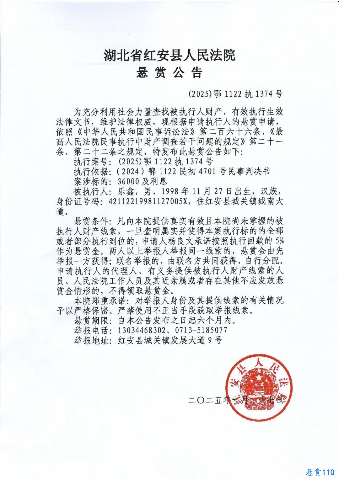 被执行人:乐鑫,男,1998年11月27日出生,汉族,身份证号码42112219981127005X,住红安县城关镇城南大道。