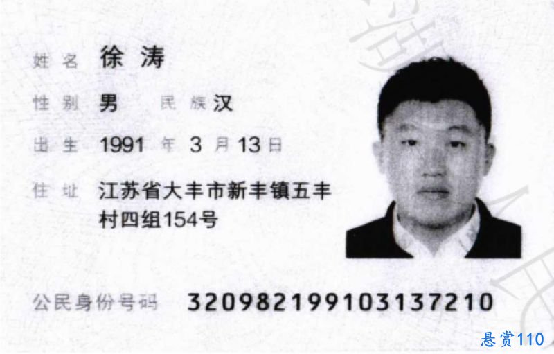被悬赏人:徐涛,男,1991年3月13日生,汉族,居民身份证号码320982199103137210,住江苏省盐城市大丰区新丰镇五丰村四组154号。