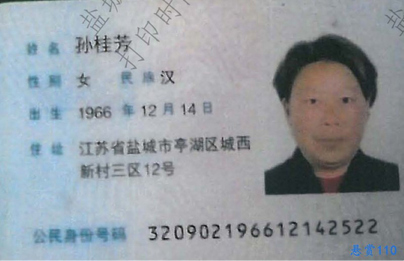 被悬赏人:孙桂芳,女,1966年12月14日生,居民身份证号码320902196612142522 ,住盐城市世纪大道1333号乔庄小区3幢302室。